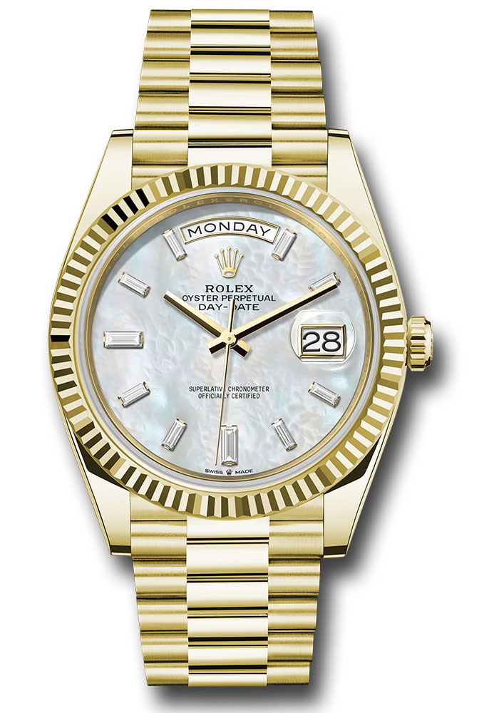 40mm 18K yellow gold case, screw-down back, screw-down crown with twinlock double waterproofness system, fluted bezel, scratch-resistant sapphire crystal with cyclops lens over the date, white mother-of-pearl dial, 10 baguette-cut hour markers, Rolex calibre 3255 perpetual self-winding movement with centre hour, minute and seconds hands, instantaneous day and date in apertures, secure rapid-setting, and stop-seconds for exact time setting, approximately 70 hours of power reserve, President bracelet with semi-circular three-piece links, concealed folding Crownclasp buckle. Waterproof to 100 metres / 330 feet.