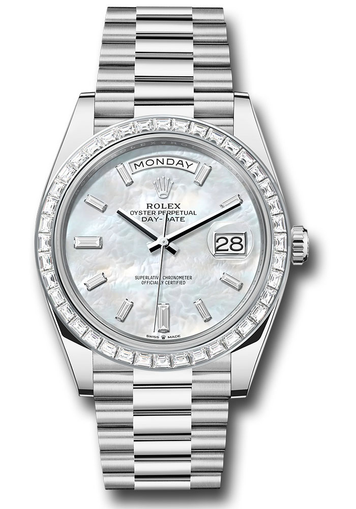 40mm platinum case, screw-down back, screw-down crown with twinlock double waterproofness system, diamond bezel, scratch-resistant sapphire crystal with cyclops lens over the date, white mother-of-pearl dial, 10 baguette-cut hour markers, Rolex calibre 3255 perpetual self-winding movement with centre hour, minute and seconds hands, instantaneous day and date in apertures, secure rapid-setting, and stop-seconds for exact time setting, approximately 70 hours of power reserve, President bracelet with semi-circular three-piece links, concealed folding Crownclasp buckle. Waterproof to 100 metres / 330 feet.