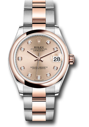 31mm Everose Rolesor case comprised of Oystersteel and 18K Everose gold, screw-down back, screw-down crown with twinlock double waterproofness system, 18K Everose gold domed bezel, scratch-resistant sapphire crystal with cyclops lens over the date, rosé dial, diamond hour markers, Rolex calibre 2236 perpetual self-winding movement with date at 3 o'clock, approximately 55 hours of power reserve, Eversose Rolesor Oyster bracelet made from a combination of steel and 18K everose gold with flat three-piece links, folding Oysterclasp buckle with Easylink 5mm comfort extension link. Waterproof to 100 meters.