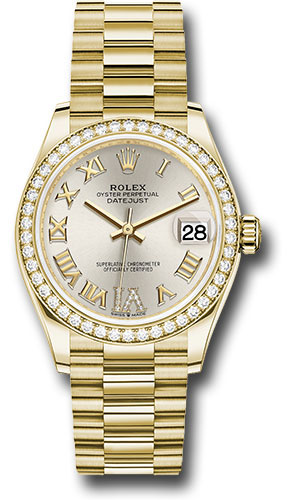 31mm 18K yellow gold case, screw-down crown with twinlock double waterproofness system, bezel set with 46 diamonds, scratch-resistant sapphire crystal with cyclops lens over the date, silver diamond Roman IV dial, Roman numerals with 11 diamonds set on VI, Rolex calibre 2236 automatic movement with center hour, minute and seconds hands, instantaneous date with rapid setting, and stop-seconds for precise time setting, approximately 55 hours of power reserve, 18K yellow gold President bracelet with semi-circular three-piece links, concealed folding Crownclasp buckle. Waterproof to 100 meters.