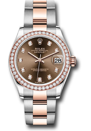 31mm Everose Rolesor case comprised of Oystersteel and 18K Everose gold, screw-down back, screw-down crown with twinlock double waterproofness system, 18K Everose gold bezel set with 46 diamonds, scratch-resistant sapphire crystal with cyclops lens over the date, chocolate dial, diamond hour markers, Rolex calibre 2236 perpetual self-winding movement with date at 3 o'clock, approximately 55 hours of power reserve, Eversose Rolesor Oyster bracelet made from a combination of steel and 18K everose gold with flat three-piece links, folding Oysterclasp buckle with Easylink 5mm comfort extension link. Waterproof to 100 meters.