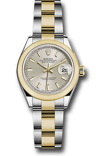 28mm yellow Rolesor case comprised of a 904L steel monobloc middle case, screw-down steel back, 18K yellow gold screw-down crown with twinlock double waterproofness system, 18K yellow gold domed bezel, scratch-resistant sapphire crystal with cyclops lens over the date and double anti-reflective coating, silver dial, index hour markers, Rolex calibre 2236 automatic movement with center hour, minute and seconds hands, instantaneous date with rapid setting, and stop-seconds for precise time setting, yellow gold Rolesor Oyster bracelet comprised of a combination of 904L steel and 18K yellow gold in flat three-piece links, folding Oysterclasp buckle with Easylink 5mm comfort extension link. Waterproof to 100 meters.