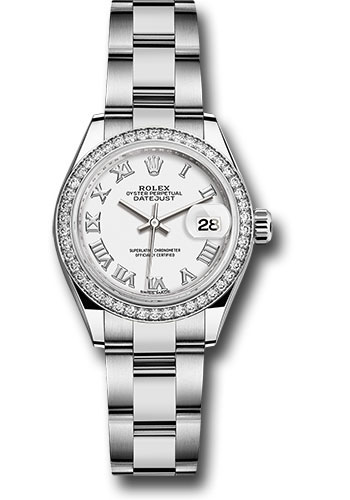 28mm white Rolesor case comprised of a 904L steel monobloc middle case, screw-down steel back, screw-down crown with twinlock double waterproofness system, 18K white gold fluted bezel set with 44 diamonds, scratch-resistant sapphire crystal with cyclops lens over the date and double anti-reflective coating, white dial, Roman numerals, Rolex calibre 2236 automatic movement with center hour, minute and seconds hands, instantaneous date with rapid setting, and stop-seconds for precise time setting, stainless steel Oyster bracelet with flat three-piece links, folding Oysterclasp buckle with Easylink 5mm comfort extension link. Waterproof to 100 meters.