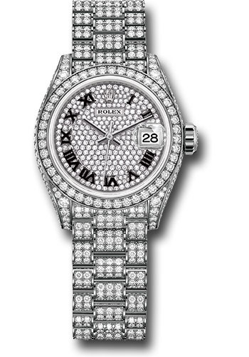 28mm 18K white gold case with sides set with diamonds, screw-down back, end pieces set with diamonds, screw-down crown with twinlock double waterproofness system, bezel set with 44 brilliant-cut diamonds, scratch-resistant sapphire crystal with cyclops lens over the date, diamond-paved dial, Roman numerals , set with 291 diamonds, Rolex calibre 2236 perpetual self-winding movement with centre hour, minute and seconds hands, instantaneous date with rapid setting, and stop-seconds for precise time setting, approximately 55 hours of power reserve, President bracelet with three-piece solid links set with 596 brilliant-cut diamonds, concealed folding Crownclasp buckle. Waterproof to 100 metres / 330 feet.