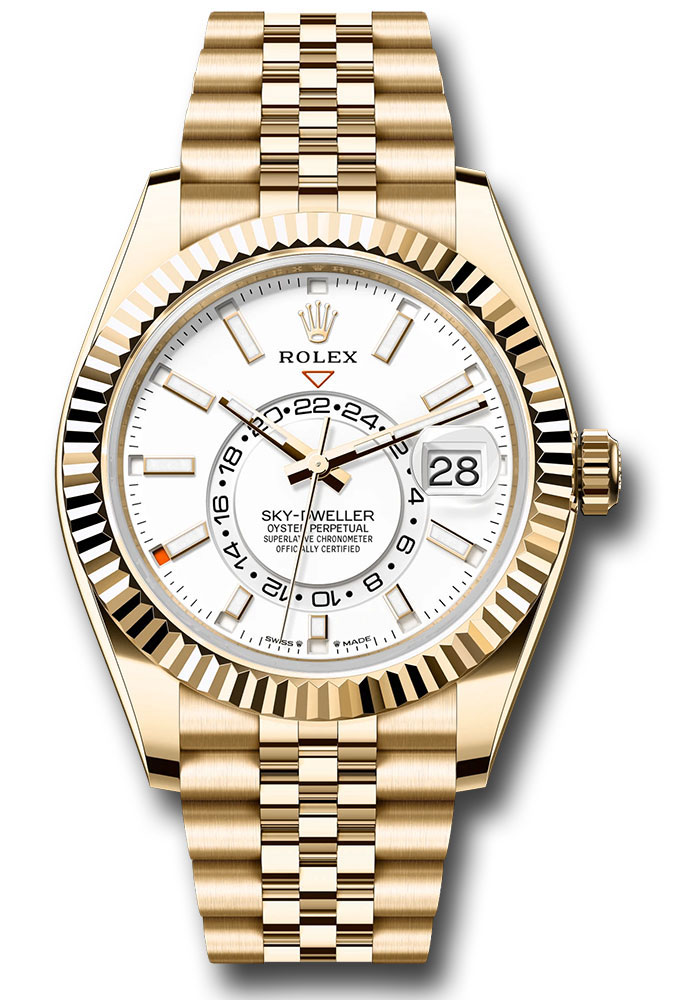42mm 18K yellow gold case, screw-down back, screw-down crown with twinlock double waterproofness system, fluted, bidirectional rotatable rolex ring command bezel, scratch-resistant sapphire crystal with cyclops lens over the date, intense white dial, index hour markers, 9002, manufacture Rolex perpetual self-winding, dual time zones, annual calendar movement with centre hour, minute and seconds hands, 24-hour display on off-centre disc, second time zone, instantaneous annual calendar at 3 o'clock and rapid-setting of the date, month display via 12 apertures around the circumference of the dial, and stop-seconds for precise time setting, approximately 72 hours of power reserve, Jubilee bracelet with five-piece links, folding Oysterclasp buckle with Easylink 5mm comfort extension link. Waterproof to 100 metres / 330 feet.