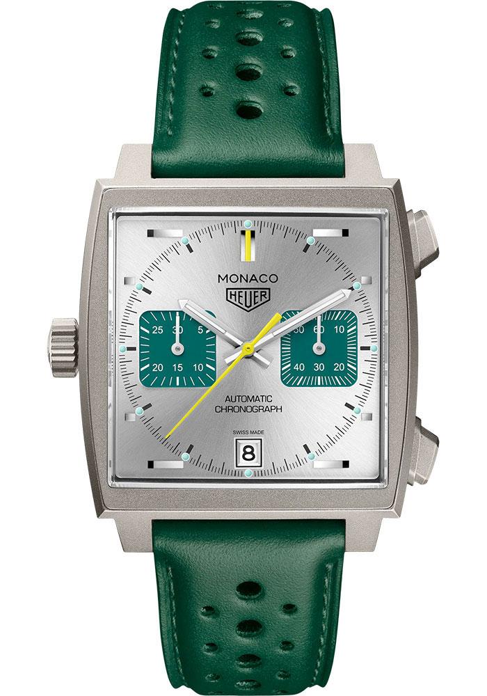 39 mm titanium case, 15 mm thick, sapphire back, green & silver dial, Calibre 11 automatic movement with hours, minutes, chronograph (seconds, 30 minutes counter, date), green strap, perforated bracelet, folding double-security buckle. Water resistant to 100 m.