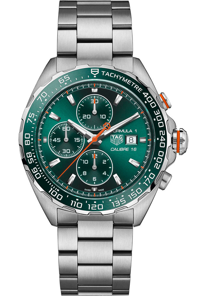 44 mm fine-brushed and polished steel case, screw-down steel crown, steel and ceramic bezel, green dial, automatic movement with hours, minutes, chronograph (1/10 second, seconds, 30 minutes counter, date), approximately 42 hours of power reserve, fine brushed steel bracelet, folding push-button buckle. Water resistant to 200 m.
