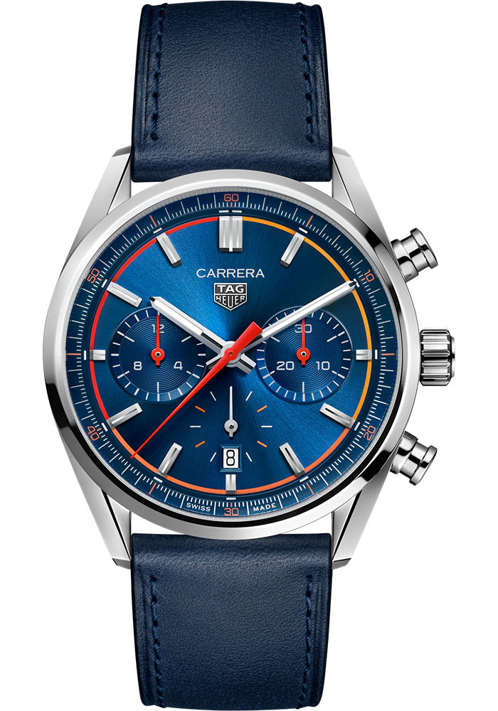 42 mm fine-brushed and polished steel case, sapphire back, steel bezel, blue dial, Calibre HEUER02 automatic chronograph movement with hours, minutes, seconds, chronograph (1/4 second, 30 minutes counter, 12 hours counter, date), approximately 80 hours of power reserve, blue leather strap, folding push-button buckle. Water resistant to 100 m.