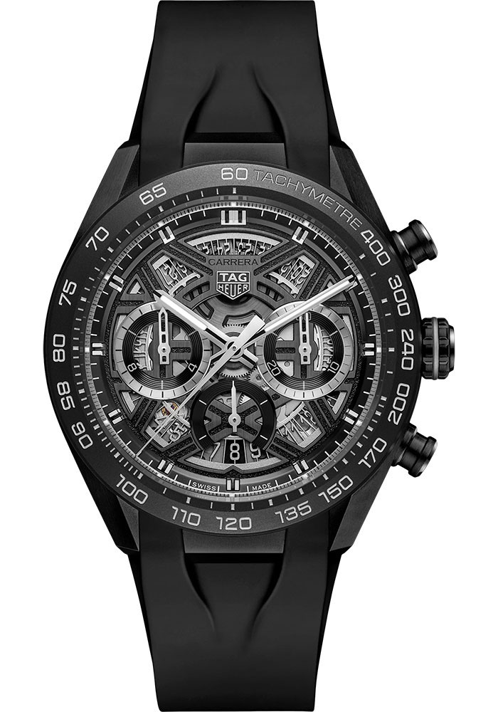 44 mm DLC titanium fine-brushed and sand-blasted case, 15.1 mm thick, sapphire back, black dlc titanium crown, black dial, TH20-00 automatic movement with hours, minutes, seconds, chronograph (1/4 second, 30 minutes counter, 12 hours counter, date), approximately 80 hours of power reserve, black rubber strap, folding push-button buckle. Water resistant to 100 m.