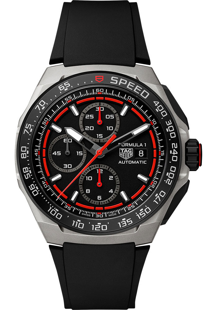 44 mm titanium case, 14.5 mm thick, screw-down titanium grade 2 crown, opalin dial, automatic movement with hours, minutes, chronograph (1/10 second, seconds, 30 minutes counter, date), approximately 42 hours of power reserve, black rubber strap, pin buckle. Water resistant to 200 m.