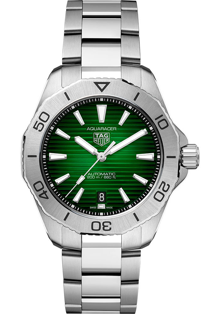 40 mm fine-brushed and polished steel case, screw-down crown, rotating steel bezel, green sunray dial, Calibre 5 automatic movement with hours, minutes, seconds, date, approximately 38 hours of power reserve, fine brushed and polished steel bracelet, folding double-security buckle. Water resistant to 200 m.