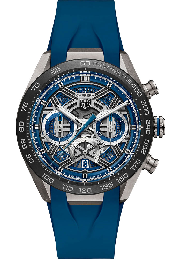 44 mm titanium fine-brushed and sand-blasted case, 15.1 mm thick, sapphire back, titanium grade 5 crown, skeleton dial, TH20-00 automatic movement with hours, minutes, seconds, chronograph (1/4 second, 30 minutes counter, 12 hours counter, date), approximately 80 hours of power reserve, orange rubber strap. Water resistant to 100 m.
