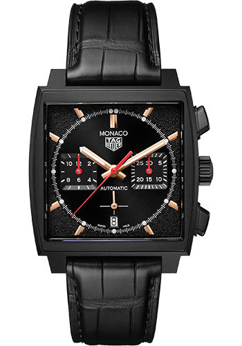 39 mm titanium DLC case, titanium bezel, black dial, Calibre HEUER02 automatic chronograph movement with hours, minutes, seconds, chronograph (1/4 second, 30 minutes counter, 12 hours counter, date), approximately 80 hours of power reserve, alligator leather strap, folding push-button buckle. Water resistant to 100 m.