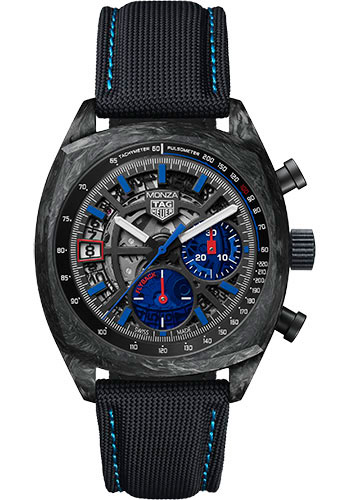 42 mm carbon case, sapphire back, carbon bezel, grey dial, automatic chronograph movement with hours, minutes, seconds, chronograph (1/4 second, 30 minutes counter), approximately 80 hours of power reserve, folding push-button buckle. Water resistant to 100 m.