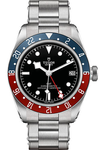 41 mm polished and satin finish stainless steel case, screw-down crown with the TUDOR rose in relief, unidirectional rotatable 48 notches Pepsi bezel with 24-hour graduated anodised aluminium disc in matt burgundy and blue, domed sapphire crystal, black domed dial, calibre MT5652 self-winding movement with GMT function, approximately 70 hours of power reserve, riveted steel bracelet. Water resistant to 660 ft (200 m). ***HOT MODEL IN STOCK NOW***