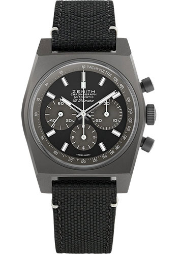37 mm microblasted titanium case in the original 1969 design, black and grey dial, El Primero 282 automatic movement with chronograph, hours and minutes in the centre, small seconds at 9 o'clock, tachymetric scale, approximately 50 hours of power reserve, black leather strap with cordura effect, microblasted titanium pin buckle. Water resistant to 5 ATM.
